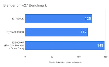 Für Blender-User bedeutet der i9-10900K einen riesigen Schritt. Im Vergleich zum i9-9900KF rechnet das neue Flaggschiff rund 14 Prozent schneller. Jedoch bleibt er noch sechs Prozent hinter dem Ryzen 9 3900X.