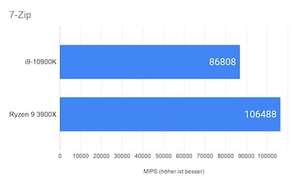 Im integrierten Benchmark von 7-Zip – ich wähle die Standard «Dictonary size» von 32 MB – erreicht der 10900K 86 808 Instruktionen pro Sekunde (MIPS). Der Ryzen 3900X schafft rund 23 Prozent mehr MIPS, was den zwei Kernen mehr geschuldet ist.