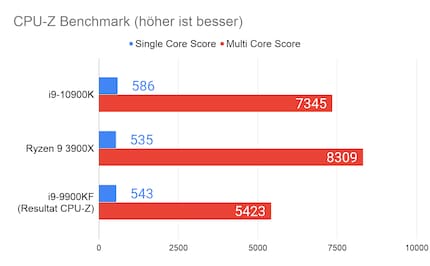 Da mir ausser dem Ryzen 9 3900X Vergleichsdaten fehlen, lasse ich den i9-10900K gegen den Vorgänger ohne integrierte Grafik i9-9900KF im Benchmark von CPU-Z antreten. Hier leistet der 10900K acht Prozent mehr als der Vorgänger im Single Core und dank den zwei Kernen mehr rund 35 Prozent mehr im Multi Core. Im Vergleich zum Ryzen 3900X mit 12 Kernen leistet der 10 Kerner i9-10900K 13 Prozent weniger.