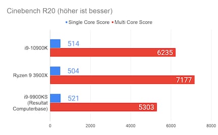 Als Referenz führe ich den Cinebench R20 Benchmark durch. Bei Stock-Einstellungen erreicht der i9-10900K einen Single Core Score von 514 und einen Multi Core Score von 6235. Dabei wird der Prozessor bis zu 73° Celsius warm. Zum Vergleich: Der Ryzen 9 3900X erreicht einen Single Core Score von 504 und einen Multi Core Score von 7177 bei zwei Kernen mehr. Dabei wird der Konkurrent mit derselben Kühlung nur 67° Celsius warm.