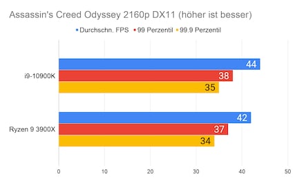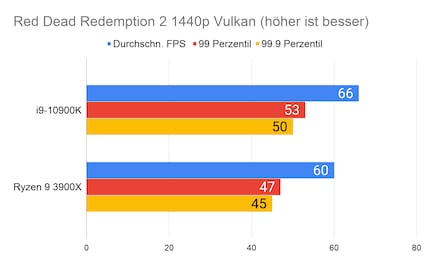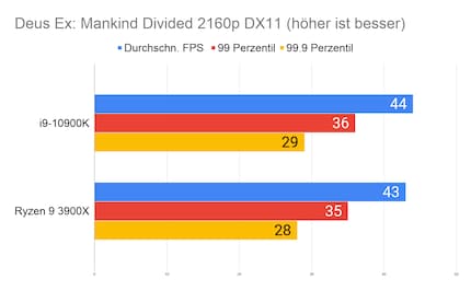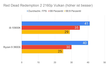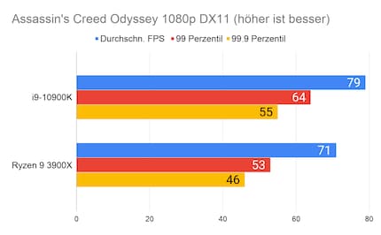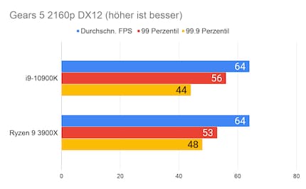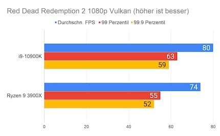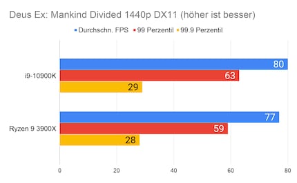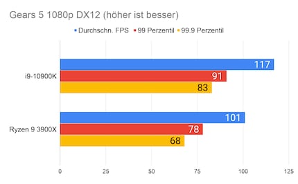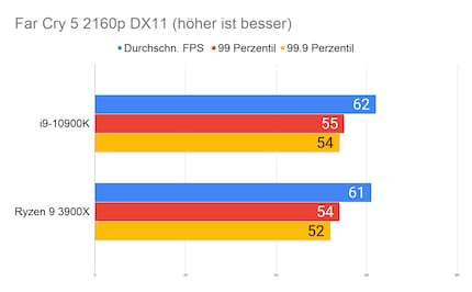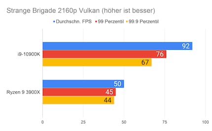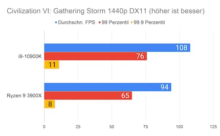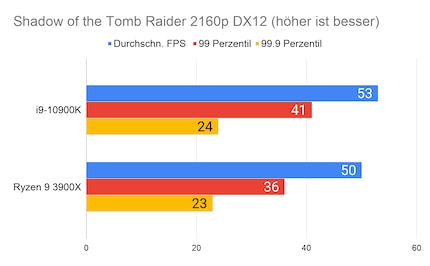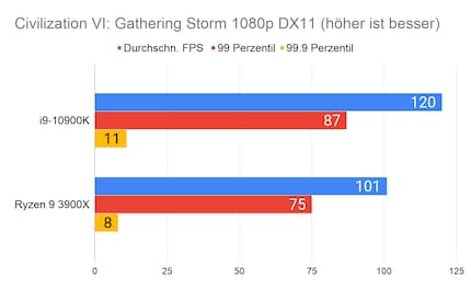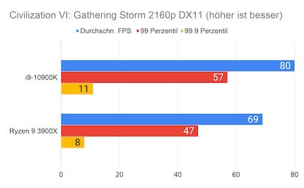Auffällig ist der grosse Unterschied bei «Strange Brigade». Den kann ich mir nur dadurch erklären, dass die CPU/GPU-Kombination beim 10900K besser ist. Klar ist auf jeden Fall: Beim Gaming hat Intel nach wie vor die Nase vorn. Besonders CPU-intensive Spiele wie «Civilization» profitieren vom hohen Takt des i9-10900K.
