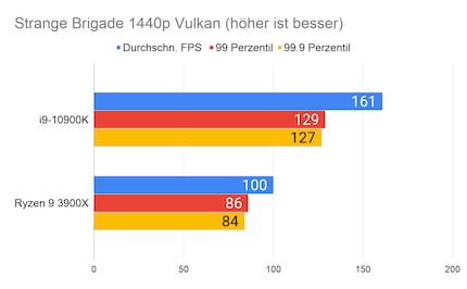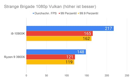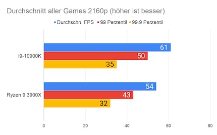 Bei den Spielen liefert der 10900K durchs Band bessere Werte als der 3900X. Der Unterschied ist bei 1080p am grössten. Bei 2160p ist meist kaum mehr ein Unterschied vorhanden. Das liegt daran, dass die CPU bei 1080p einen grösseren Unterschied macht, als bei höheren Auflösungen. Bei 2160p ist die GPU ausschlaggebender. Der Unterschied über alle Spiele beträgt 16 Prozent in 1080p und 13 Prozent in 2160p. Die grossen Unterschiede sind vor allem «Strange Brigade» geschuldet. Würde ich dieses Spiel bei der Berechnung weglassen, würde der Unterschied bei 1080p nur noch 12.5 Prozent und bei 2160p gar nur noch viereinhalb Prozent betragen.