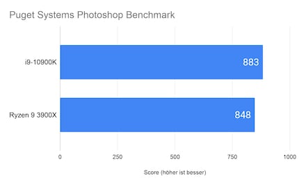 Beim Photoshop Benchmark von Puget Systems werden verschiedene Workloads durchgeführt. Genauere Infos findest du hier. Am Schluss berechnet der Benchmark einen Score, der sich an einer Referenzworkstation orientiert. Die erreicht 1000 Punkte. Die schlechteren Ergebnisse des i9-10900K und Ryzen 9 3900X, obwohl sie neuer sind als der i9-9900K in der Workstation, lassen sich durch das RAM erklären. Die Referenzworkstation hat 64 GB verbaut, unsere Testbench nur 16 GB. Hier schlägt der i9-10900K den 3900X um vier Prozent.