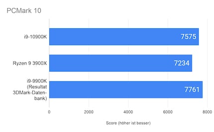 Der PCMark 10 Benchmark testet diverse Szenarien wie die Ladezeit von Apps, Effizienz bei Tabellenkalkulationen, Browsen oder auch Photo und Videobearbeitung. Daraus berechnet er einen Score. In diesen Aufgaben schneidet der 10900K knapp fünf Prozent besser ab als der 3900X. Um einen Vergleich zum Vorgänger zu ziehen, suche ich nach einem Vergleichbaren Resultat des i9-9900K in der Datenbank von 3DMark, dem Vertreiber des Benchmarks. Platz 6 in dieser Rangliste verwendet nebst dem i9-9900K und einer 2080 Super 16 GB RAM wie unsere Testbench. Mit 7761 Punkten ist das System rund zweieinhalb Prozent schneller. Übertaktet scheint es nicht zu sein.