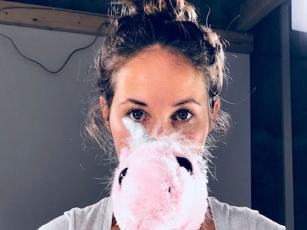 Stephanie Tresch und Videomaskottchen HornyDer einzige Wermutstropfen: Der Preis