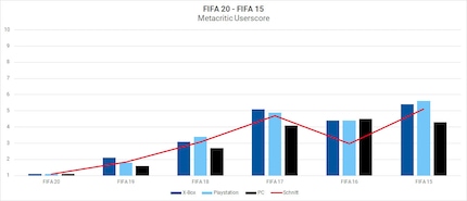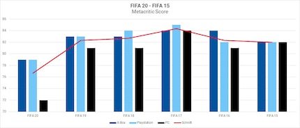 Käufer tendieren dazu, ihren Frust rauszulassen und ein Produkt nicht objektiv zu bewerten, was in einer unterirdischen Bewertung endet. royalprinz99 hat das vorgemacht und einen Stern vergeben hat. Was sagen aber die Kritiker, die nicht bloss ihrem Ärger über ein misslungenes Feature Luft machen wollen? Auch die Review-Auswertung bei Metacritic zeigt: Fifa 20 ist das schlechteste Fifa der letzten fünf Jahre und das deutlich. Durchschnittlich 76.67 Punkte von 100 haben die Kritiker über alle Plattformen vergeben. Alle anderen Ausgaben der letzten fünf Jahre wurden über 80 bewertet. Damit ist die Aussage von royalprinz99 also auch hier korrekt.