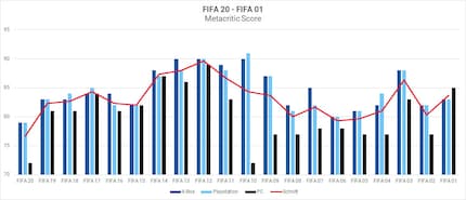 Ist Fifa 20 vielleicht sogar das schlechteste Fifa aller Zeiten? Dazu habe ich die Daten sämtlicher Games zusammengetragen, seit die Xbox erschienen ist, also seit 2001. Zuvor gab es zwar Fifa, allerdings sind die Daten von Metacritic dort lückenhaft. Und siehe da. Fifa 20 ist tatsächlich das schlechteste Fifa aller Zeiten. Nur gerade Fifa 06 und 05 wurden im Schnitt knapp unter 80 bewertet. Fifa 20 liegt rund 3 Prozentpunkten darunter bei 76.67 Prozent.