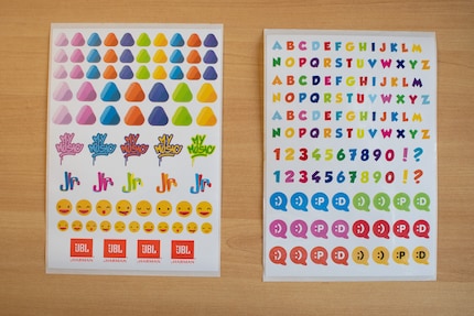 Beide Kopfhörer werden mit sehr ähnlichen Aufklebern geliefert, mit denen dein Nachwuchs die Kopfhörer verschönern kann. Die Buchstaben-Kleber des JVC scheinen mir pädagogisch wertvoller als die Marken-Logos von JBL.
