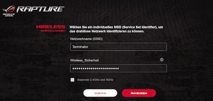 Neben einem Account-Namen und Passwort für den Router-Zugriff, müssen SSID und WiFi-Passwort bestimmt werden. Dabei kannst du bei Bedarf auch getrennte 2.4- und 5-GHz-Netzwerke erstellen. Guten Mutes nenne ich mein neues WiFi «Terminator».