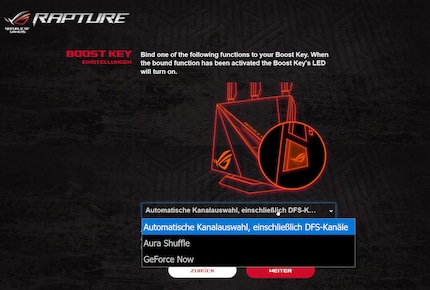 Nun darf der «Boost Key», einer konfigurierbaren Taste mit ROG-Logo an der Seite des Routers, eine Funktion zugewiesen werden. Wählen kann ich zwischen «Automatische Kanalauswahl», «Aura Shuffle» und «GeForce Now».
