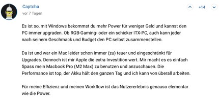 Wer sich stark mit einem Produkt identifiziert, ist emotional investiert. Kritik am Lieblingsgerät ist dann ähnlich schlimm wie Kritik an einem Familienmitglied. Da geht's sofort in die Defensive oder Gegenoffensive. Es ist okay, die eigene Meinung über ein Produkt oder eine Marke mit anderen zu teilen. Nur zwei Sachen wünsche ich mir manchmal, wenn ich die Kommentarspalten lese: