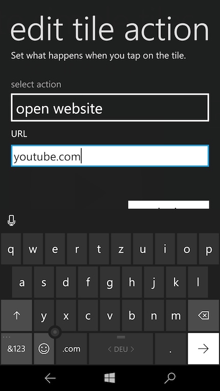 Unter URL musst du nun einfach youtube.com eingeben und danach auf Back klicken. Dann am unteren Bildschirm einfach das Pfeil-Symbol klicken und die Kachel wird dem Desktop hinzugefügt.
