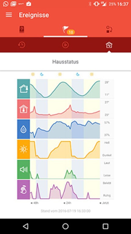 Sinnvoll wäre es zum Beispiel im «Daheim-Modus» nur extreme (Grenzwerte lassen sich festlegen) Temperaturschwankungen per Sirene zu signalisieren, falls beispielsweise ein Brand ausbricht. Im «Unterwegs-Modus» hingegen macht es durchaus Sinn, auch einen Videoclip aufzuzeichnen und eine Push-Benachrichtigung zu erhalten. Die Kombinationen sind natürlich je nach Situation anpassbar.