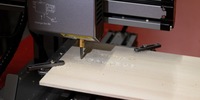 Mit all den Einstellungsmöglichkeiten bin ich überfordert. Egal, denke ich mir, die Standardeinstellungen werden schon in Ordnung sein. Ich erstelle den Code. Da ich hauptsächlich Acryl fräsen will, spanne ich ein drei Millimeter dickes Stück direkt auf die Bauplatte. Auf eine Opferplatte (Unterlage) zum Schutz verzichte ich, mein Testmodell soll nur ein Millimeter tief werden. Ich erstelle die Nullpunkte aller drei Achsen und lade den G-Code in GRBL. Jetzt muss ich nur noch auf Start drücken.