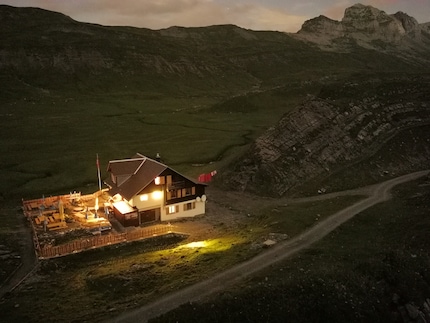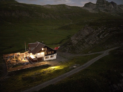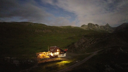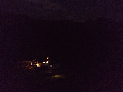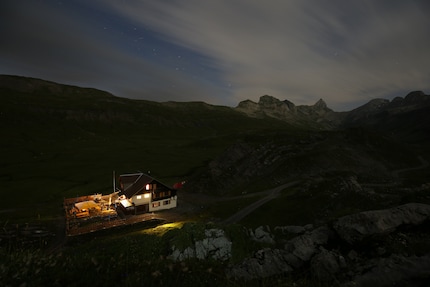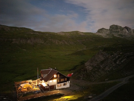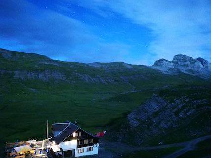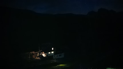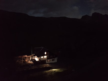 Nach Einbruch der Dunkelheit hiess es dann: Stirnlampe auf. Wir suchen einen geeigneten Spot für die erste Fotosession. Das Gasthaus in der Dunkelheit mit wunderbarer Bergkulisse im Hintergrund war dann das erste Motiv.