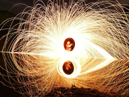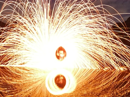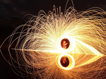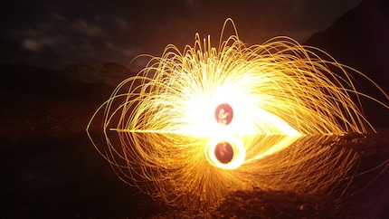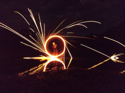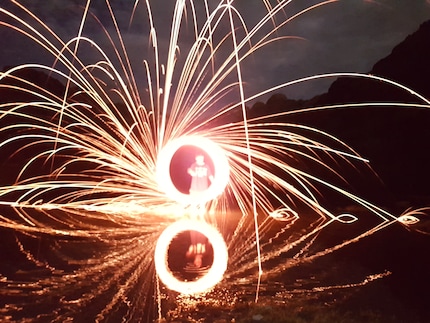 Den Schwingbesen haben wir mit Stahlwolle gefüllt, den Griff an etwas Seil angemacht und dann angezündet und geschwungen. Aber Achtung! Heiss und gefährlich! Durch die Schwingung fliegen kleine, glühende Stücke der Stahlwolle umher und erzeugen so Formen in der Luft.