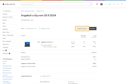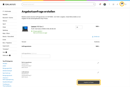 Bisher konnten Firmenkunden bei Galaxus und Digitec nur per E-Mail Offerten einholen – ein manueller und zeitaufwändiger Prozess. Nun ist Schluss mit ellenlangen Excel-Dokumenten, Screenshots des Warenkorbs und E-Mail Ping-Pong. Ab sofort bieten wir eine neue, smarte Lösung: Alles, was dein Unternehmen braucht, kannst du neu direkt über den Onlineshop anfragen.