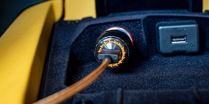 Der 12-Volt-Adapter ist das Teil, auf dem das Ypsilon zum Tragen kommt. Da ist ein Kranz um den USB-Stecker, der an die Rücklichter des Lamborghinis erinnert. Wenn du dein Phone an ein Auto anschliesst – geht nicht nur bei italienischen Luxusautos – und das Phone lädt, dann leuchten die Y-Formen auf.