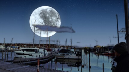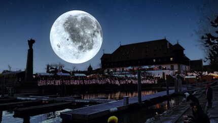 Wenn du die App startest und einen Filter auswählst, sagen wir «Night Shift» Filtervariante 3 von 5, dann fordert die App dich auf, die Kamera auf etwas mit einem Himmel zu richten. «Find a sky» heisst es auf dem Bildschirm. Sobald die Kamera etwas erkennt, das Himmel sein könnte, ersetzt sie den Himmel in der Live-Vorschau durch einen gigantischen Mond.