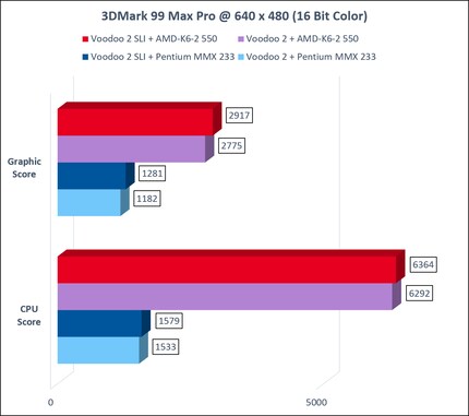 Bei der Auflösung von 640 × 480 Pixel ist beim Graphic Score zwischen einer und zwei Voodoo-2-Karten (SLI) im Einsatz nur ein relativ kleiner Unterschied auszumachen. Das bedeutet unter Verwendung des AMD-Prozessors eine Leistungssteigerung von 5,1 Prozent, mit der Intel-CPU sind es 8,3 Prozent.