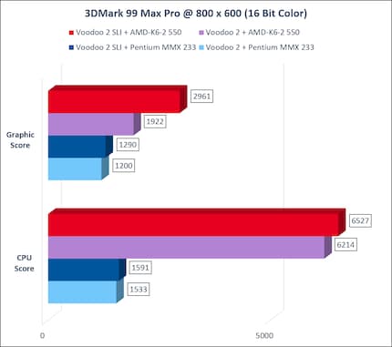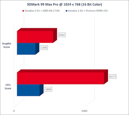 Krasser fällt die Leistungssteigerung beim Vergleich der beiden Prozessoren aus. Beim SLI-Betrieb erreicht der 550 MHz taktenden K6-2 einen um 127,71 besseren Graphic Score von 2917. Beim CPU Score sind’s sogar 303,03 Prozent mehr Leistung. Das ist in Anbetracht der bei AMD um 317 MHz höheren Taktfrequenz, einem doppelt so grossen L1 Cache von 64 Kilobyte (32 KB Code / 32 KB Data) und der Unterstützung der Multimedia-Befehlssatzerweiterung 3Dnow! nicht verwunderlich.
