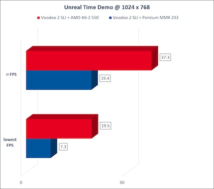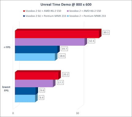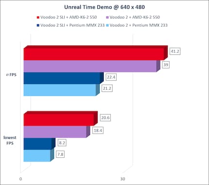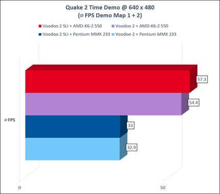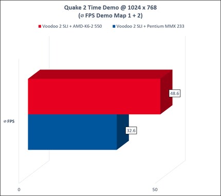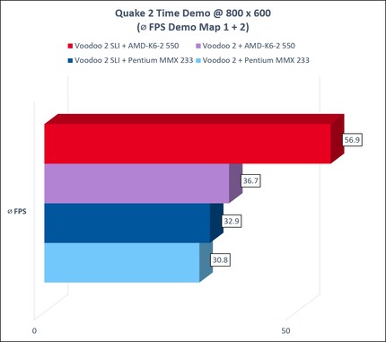 Die Resultate bestätigen die Tests von 3DMark 99 teilweise: Bei 640 × 480 bringen zwei Voodoo 2 gegenüber nur einer lediglich einen kleinen Leistungszuwachs. Bei 800 × 600 profitiert SLI zumindest mit dem neuen Prozessor und holt ein Plus von 20,2 Frames, von 55,04 Prozent mehr Leistung, heraus.