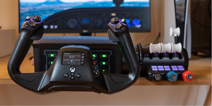 Für Schub sorgen entweder vier Schubregler oder Zughebel, wie sie in Propellermaschinen oft zum Einsatz kommen. Vor allem die Zughebel machen richtig Spass und lassen mich mit meiner Cessna 172 voll eintauchen. Sichtflug mit einer einmotorigen Propellermaschine – dafür ist dieser Controller erschaffen worden. Auf dem Display lässt sich nämlich bequem eine Stoppuhr einblenden, die dir bei deinen Buschflügen hilft, die Distanzen abzuschätzen. Mit einem ausgedruckten Flugplan und einer Karte auf deinem Tablet ist die Illusion perfekt. Dazu trägt das Steuerhorn bei, das sich in alle Richtungen angenehm drehen, ziehen und stossen lässt. Andere Reviews haben bemängelt, dass die Steuerung teilweise zu hart sei. Das konnte ich nicht feststellen.