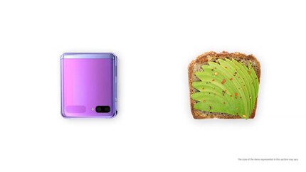 Im Hintergrund tönt Billie Eilishs «Bad Guy». Es breche mit den Gesetzen der Physik, heisst es weiter, denn das Z Flip falte Glas. Danach eine Parfümflasche zum Grössenvergleich, ein Portemonnaie, eine Scheibe Avocado-Toast, Youtube-Kommentare und Yoga.