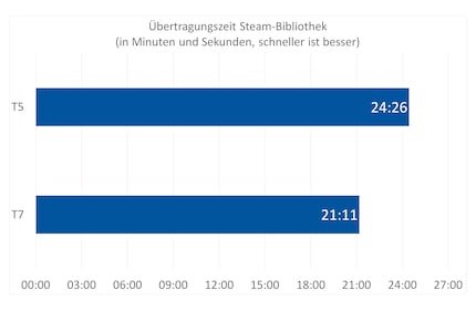 Die T7 Touch ist beim Lesen durchs Band schneller als die die T5. Beim Schreiben ist die T5 bei Kleinstdateien schneller. Ab 64 KB ist die T7 aber wieder schneller. Beim Lesen ist sie rund 127 Prozent schneller und beim Schreiben rund 77 Prozent.