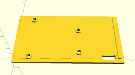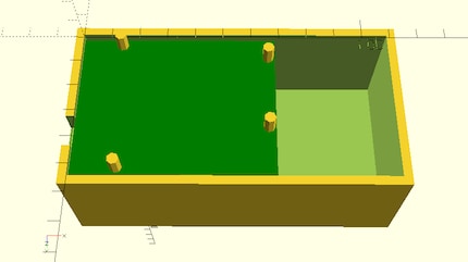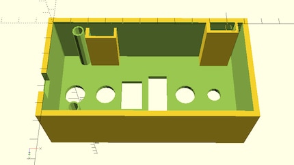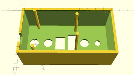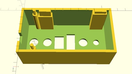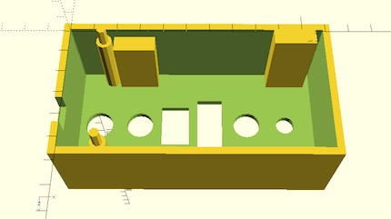 Ich habe ein sehr einfaches Gehäuse entworfen. Es besteht aus einem Viereck, dem ein kleineres Viereck abgezogen wurde, einer zusätzlichen Leiste als Tischkantenauflage, Löcher für die Schalter und Stützen für den Arduino und die Schraubzwingen. Und zu Guter Letzt ein Deckel als Abschluss. Auch hier gilt: Komplizierter geht immer, z.B. schräge Wände, Rundungen und so weiter.