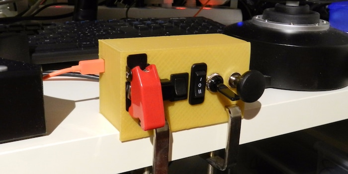 Gebaut habe ich es für den Einsatz mit der Oculus Rift. Daher die Auflage für an die Tischkante und die Verschraubung. Damit man es blind ertasten kann, sind alle Tasten und Schalter unterschiedlich. Die dunkelgelbe Farbe hilft, damit man die Details besser erkennen kann. Schwarze Schalter in schwarzem Gehäuse sind auf dem Foto schlecht zu sehen und im Cyberspace wenn man die Brille trägt, kann man die Farbe ja sowieso nicht sehen 😉.