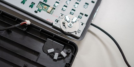Alle anzeigenJede Tastatur ist im Prinzip gleich aufgebaut: Damit ich sehe, was im Innern der MK-95 schlummert, muss ich die Deckplatte entfernen. Die ist mit Schrauben am Gehäuse befestigt. Um alle Schrauben aufzuspüren, muss ich die Keycaps entfernen. Nachdem ich alle Schrauben gelöst habe, versuche ich, die Deckplatte anzuheben. Dazu verwende ich «Jimmy» – ein Werkzeug zum Öffnen von Elektrogeräten. Jimmy hat mir in der Vergangenheit schon öfters geholfen. Und tatsächlich: Die Klinge flutscht problemlos zwischen Deckplatte und Gehäuse.
