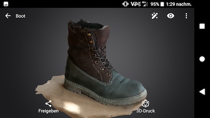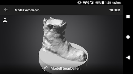 Und schlussendlich, ein tatsächliches Verkaufsargument: 3D-Drucken.Wenn du die Datei fürs 3D-Drucken exportierst, oder direkt vom Handy druckst, wird die Applikation einen Sockel mit dem Namen des Objekts hinzufügen. Das ist ein eleganter Weg, die unebene Fläche wegzukriegen, die durch das Scannen entsteht.