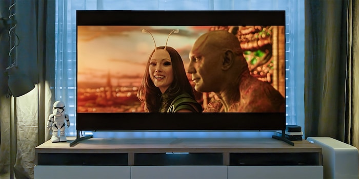 Will ich einen Fernseher auf seine Farbwiedergabe testen, greife ich auf «Guardians of the Galaxy, Vol. 2» zurück. Besonders auf diese Szene: Sie zeichnet feinste Details am Himmel, ohne sie zu überstrahlen, hat den gewissen Punch im Bild, den ich an OLED-Displays – ob mit oder ohne «QD» vorne dran – so mag und Egos goldener Palast knallt im gesättigten Abendrot. Sonys A95L trifft dabei die Intention des Regisseurs, die kitschige «Golden Hour» des Planeten einzufangen, perfekt. Besonders gut gefallen mir die warmen, rötlichen Hauttöne, die bei LGs starkem OLED-MLA-Panel und Samsungs QD-OLED-Cousin etwas gar gelblich daherkommen.