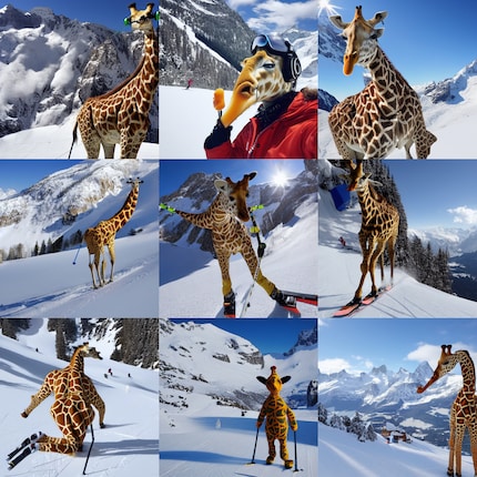 Ich tippe zu Beginn «cheesy giraffe skiing in the Swiss mountains wearing headphones» ein. Also eine Giraffe, die in den Schweizer Bergen mit Kopfhörern Ski fährt. Die Texteingaben klappen mit Englisch am besten, weil das Datenmaterial, mit dem StableDiffusion trainiert wurde, hauptsächlich in Englisch ist.
