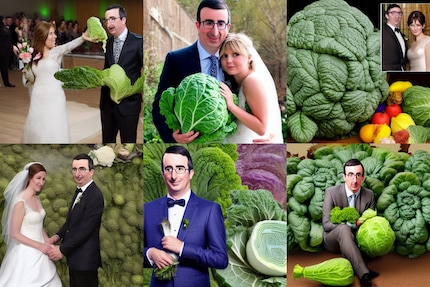 Zwar kommen die im Text erwähnten Elemente in den Bildern vor – aber nicht in der beschriebenen Form. Nirgends heiratet John Oliver einen Kohl. Warum komme ich überhaupt auf so einen Quatsch? Weil in einem John-Oliver-Video jemand dasselbe mit dem Bildgenerator Midjourney ausprobiert hat. Midjourney scheitert genauso wie StableDiffusion.