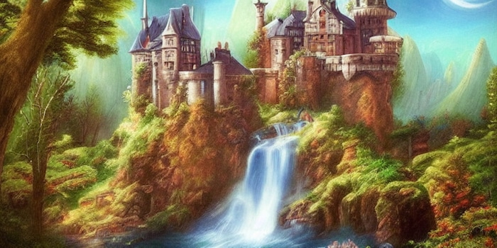 Hier einige Bilder zum Text «a beautiful castle beside a waterfall in the woods, fantasy painting».