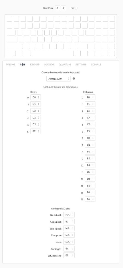 Nach der Verdrahtung müssen auch noch die Pins korrekt zugewiesen werden. Zeilen und Spalten sind mit dem Controller des PCB verbunden. Sollten sie nicht richtig zugewiesen sein, kann es sein, dass gewisse Tasten, Zeilen oder Spalten nicht richtig funktionieren. Auch hier solltet ihr euch an den Vorlagen orientieren. Ich habe beim besten Willen nicht herausgefunden, wo ich die Angaben sonst finde. Und obwohl ich ein etwas anderes Layout habe, hat es mit den Vorgaben einwandfrei geklappt.