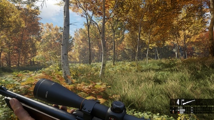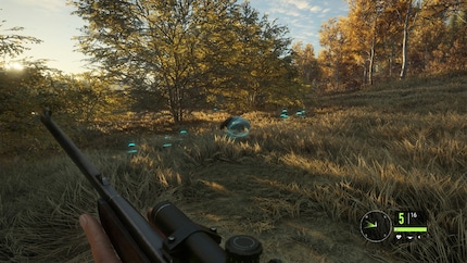 Das Spiel ist bemüht, möglichst realistisch zu sein und zeigt nach dem Abschuss exakt auf, wo man das Tier getroffen hat. Und genau wie der Experte es erklärt hat, erzielt ein Schuss durchs Herz am meisten Punkte. So weit sind wir aber noch nicht. Wir schleichen immer noch im Tempo einer Weinbergschnecke durch den dichten Wald. In jedem anderen Spiel würde ich längst auf die Shift-Taste hämmern, um zu rennen. Weil ich mich aber nicht jetzt schon lächerlich machen will, bewege ich mich im Schritttempo, um das Wild nicht aufzuschrecken – wo auch immer es sich verstecken mag. Gesehen haben wir nämlich ausser ein paar Hasen und Vögeln noch nichts. «Meinst du, ich bin zu laut?», frag ich Dres. Hauptsächlich um etwas Kommunikation zu machen. «Viel zu laut. Würdest du wirklich Hirsche jagen, würden die dich längst hören.» Ich bin eben doch immer noch zu ungeduldig. Bereits im Normaltempo könnt ihr eure Beute verscheuchen je nach dem auf welchem Untergrund ihr euch bewegt. Das laute Knacken, wenn ihr direkt durch einen Busch geht, statt drum herum, kann reichen, dass das Wild Warnrufe von sich gibt. Das hilft mir wenigstens, die Tiere zu Orten.