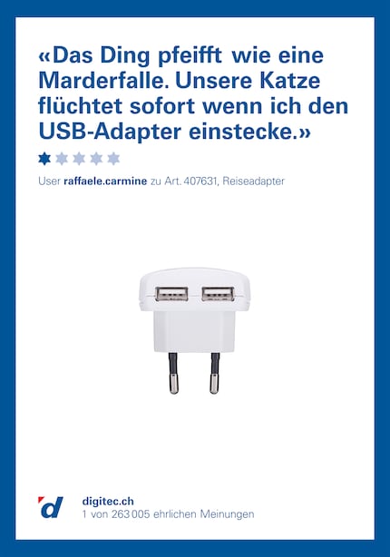«Das Ding pfeift wie eine Marderfalle. Unsere Katze flüchtet sofort wenn ich den USB-Adapter einstecke.» Das schreibt digitec-User Raffaele Carmine. Sein Fazit hat es in unsere Community-Kampagne geschafft. Und weil unsere Crea-Abteilung, die hinter diesen Plakaten steht, uns gefragt hat, ob wir die Kampagne thematisch begleiten wollen, dachte ich, ich zweckentfremde mal kurzerhand diesen Adapter.