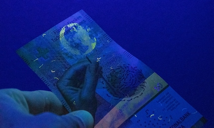 In Geldscheinen sind fluoreszierende Teile eingearbeitet. Es ist eines von vielen Merkmalen, mit denen sich echte von gefälschten Banknoten unterscheiden lassen. Hier eine 50-Franken-Note im UV-Licht. Ich muss sie ziemlich nahe an die Lampe halten, um den Effekt sichtbar zu machen.