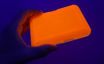 Leuchtstiftspuren auf Papier leuchten auch. Das bringt mich auf die Idee, nach ähnlichen Farben im Haushalt zu suchen. Tatsächlich finde ich eine Kunststoffbox, die sehr stark leuchtet – und erst noch in einer Farbe, die gut zum dunkelvioletten Hintergrund passt.