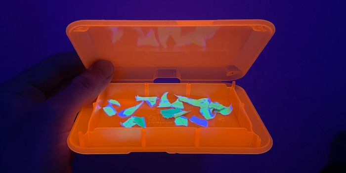 Benötigt wird auch ein Raum, der sehr, sehr dunkel ist. Und nicht zuletzt Motive mit fluoreszierenden Oberflächen.