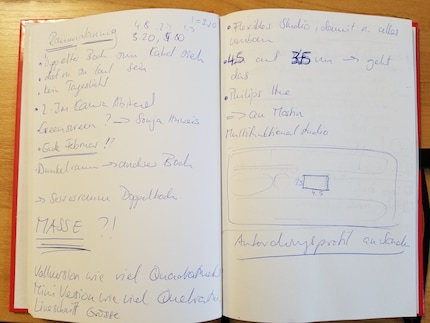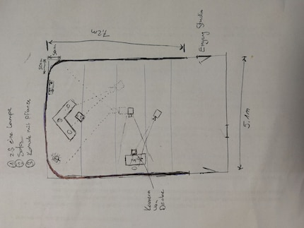 Manuel hat hier eine Skizze erstellt, wie wir das Studio aufbauen wollen.Da wir nicht auf kahlen Betonwänden drehen können, aber gleichzeitig noch mit der Problematik konfrontiert werden, dass wir unser Studio in einem Schutzraum bauen, sind wir gezwungen, gewisse Regeln zu beachten. Innerhalb von 24 Stunden müssen wir den Raum theoretisch ausräumen können. Also müssen Wände aufgezogen werden, die Balken tragen, die wiederum eine Kamera und sechs Lichter und Kabelsalat tragen. Ein Raum in einem Raum, quasi.