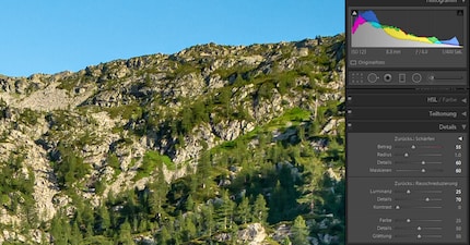 In Lightroom befinden sich die Einstellungen zum Schärfen unter dem Eintrag «Details». Im Camera Raw ist dies das dritte Mini-Icon mit den zwei spitzen Dreiecken. Die Regler «Betrag» und «Details» machen das Bild schärfer, verstärken aber auch das Rauschen.