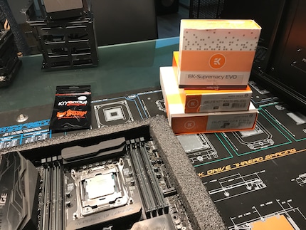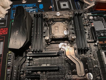 Die CPU, ein Intel Core i7 6900K, ist montiert und ready für die Wärmeleitpaste. Ich verwende hier die Thermal Grizzly Krynoaut, da sie meiner Meinung nach mit Abstand die beste Wärmeleitfähigkeit besitzt. Das Mainboard, ein Rampage V Edition 10, ist nun bereit, um mit dem Wasserkühler bestückt zu werden.
