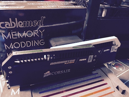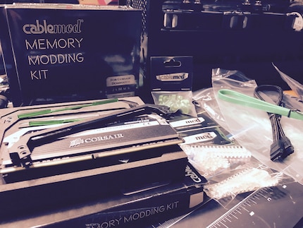 Wenn ich schon am Umbauen der Komponenten bin, dann kommt natürlich auch der RAM dran. Ich habe mir hier für meinen Corsair Dominator von Cablemod das Modding Kit geholt. Dieses besteht aus einer schwarzen Aluminum-Abdeckung, welche die silberne ersetzt und Kunststoff-Einsätze in diversen Farben besitzt. Die Dominator haben weisse LEDs verbaut, so kann man die Dominator in einer anderen Farbe erstrahlen lassen.