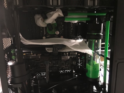 Der grosse Moment ist da, der Loop befüllt – hoffentlich ist alles dicht!! War es leider nicht, denn ein Fitting war nicht ganz angezogen. Zum Glück unter dem AGB, wo das auslaufende Kühlwasser keinen grossen Schaden anrichten konnte und auch nur ganz wenig tröpfelte. Der Schaden war daher schnell behoben und die anfängliche Enttäuschung ebenso rasch verflogen. Daher lege ich euch nochmals nahe: Arbeitet ganz exakt und prüft alle Fittings lieber einmal zu viel.