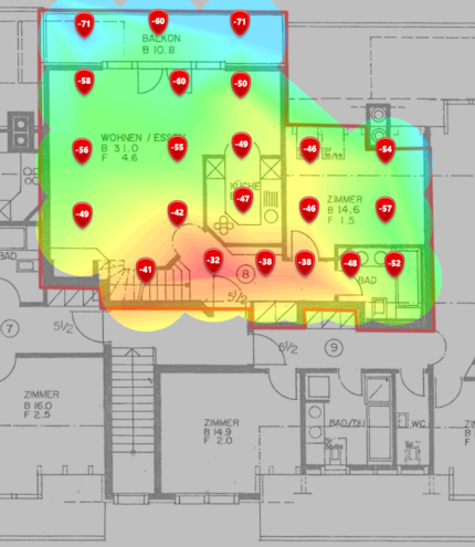 Bei den folgenden Heatmaps ist die Signalabdeckung farblich visualisiert: Überall, wo es Richtung Blau geht, ist das Funksignal schlecht. Bei Türkis bricht der Datendurchsatz, wie etwa auf dem Balkon, bereits stark ein.