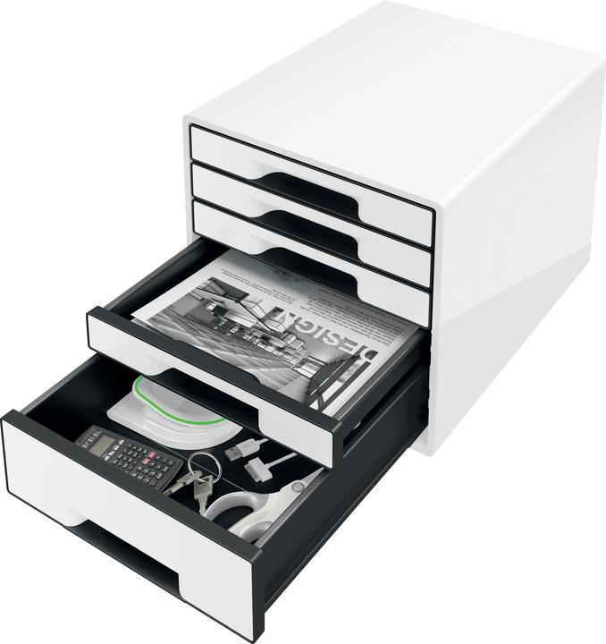 Auffällige Wow Cube Schubladenbox in Premium-Qualität mit modernem zweifarbigem Wow-Effekt in Hochglanz. Der robuste Cube passt perfekt zu allen anderen Produkten der Leitz Wow Serie und eignet sich ideal für ein perfekt aussehendes Büro oder Home Office. Die Box verfügt über vier flache Schubladen zur Aufbewahrung von Dokumenten, Prospekt- und Sicht-hüllen oder Jurismappen sowie eine hohe Schublade für Schreibtischzubehör wie Heftgerät und Mobilgeräte. Die leichtlaufenden Schubladen haben einen Auszugsstopp, damit sie nicht herausfallen können, und rasten beim Schliessen sicher ein. Die geschlossenen Schubladenfronten bieten einen modernen Sichtschutz und sind mit einer ergonomischen Griffmulde für bequemes Öffnen ausgestattet. Rutschfeste, möbelschonende Gummifüsse ermöglichen ein platzsparendes Stapeln von bis zu drei Sets. Ein ergonomisches Griffloch im Boden der flachen Schubladen erleichtert die Entnahme der Dokumente.